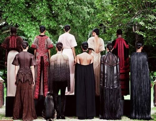 紀(jì)梵希2012年秋冬高級(jí)定制,透過(guò)強(qiáng)烈的對(duì)比設(shè)計(jì),本季高級(jí)定制系列盡顯高超的手工工藝。Riccardo Tisci巧妙地利用對(duì)比效果,彰顯出女性的力量與魅力。濃郁的吉普賽風(fēng)情與60年代的簡(jiǎn)約線條交融互匯,豐富精致的材質(zhì)、工藝與極簡(jiǎn)的構(gòu)圖相映生輝。繭狀披肩上,飾有金屬環(huán)的編織皮革和精細(xì)的紅色珠繡圖案,格外醒目。此圖案更延伸至黑紅串珠流蘇的末端。