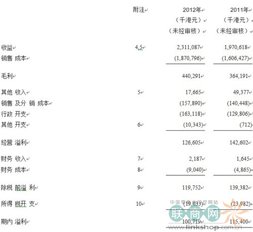 聯(lián)商網(wǎng)消息:好孩子國際昨晚發(fā)布2012年中期業(yè)績公告。公告顯示,截至2012年6月30日止六個月好孩子國際的收益約為 23.11億港元,較2011年同期約高出17.3%;毛利約為4.4億港元,較2011年同期上升20.9%;毛利率約為19.1%;溢利約為1億港元,較2011年同期約1.15億港元下跌12.7%。