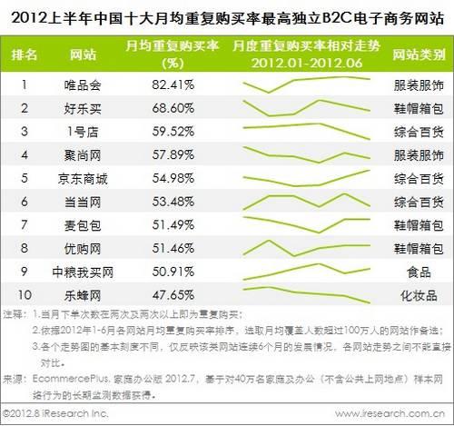 艾瑞網(wǎng)公布了2012年上半年電商網(wǎng)站月均重復(fù)購買率榜單,其中唯品會、好樂買和1號店位列前三,其中唯品會月均復(fù)購率達(dá)82.41%,領(lǐng)先整個行業(yè)。