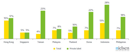 Nielsen的報(bào)告發(fā)現(xiàn)商店自有品牌在亞洲發(fā)展仍然較慢,在現(xiàn)代經(jīng)銷渠道中銷售占比不到8%。商店自有品牌增長最快的地方在臺灣,韓國和印尼,銷售增長都超過20%。自有品牌的銷售開始在一些基礎(chǔ)的百貨產(chǎn)品品類中獲得吸引力,這些品類有紙制品、塑料包裝和飲用水,以及主食。包括大米,食材,消費(fèi)者對這類產(chǎn)品的價(jià)格尤其敏感。亞洲私有品牌發(fā)展受阻的原因主要是用戶的低信任度,而這些商品本身有較高的品牌忠誠。
