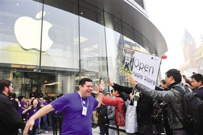 10月20日上午9時(shí),上千人高呼著“Apple!Apple!”涌入王府井蘋果零售店。蘋果工作人員穿著藍(lán)色T恤衫,一邊按節(jié)奏拍掌鼓勁,一邊齊聲高喊“Apple,Go,Go,Go!”每個(gè)員工臉上都笑著跟入店的果粉打招呼。一位果粉講,他喜歡蘋果的氛圍,很熱情,感覺自己受到尊重。