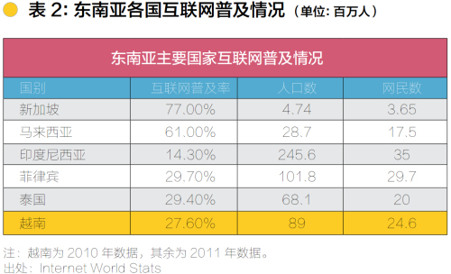 新加坡和馬來西亞等富裕國家,網民絕對數(shù)值比其他國家小,但是普及率都在5成以上,2011年新加坡77%,馬來西亞61%。印度尼西亞、菲律賓、泰國、越南的互聯(lián)網普及率雖維持在一個較低的水平,但由于人口基數(shù)較大,網民人數(shù)相對較多,其中東南亞總人口最多的印度尼西亞網民數(shù)量最多(3,500萬人)。而截至2011年12月底,中國互聯(lián)網普及率較上年底提升4個百分點,達到38.3%,普及率低于新加坡和馬來西亞,高于印度尼西亞、菲律賓、泰國、越南;中國網民規(guī)模達到5.13億,遠超過東南亞任一國家。