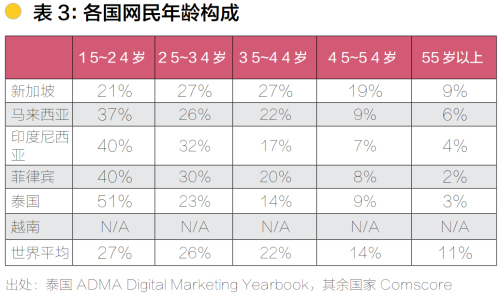 除了新加坡,東南亞網民大多數(shù)是34歲以下的人群。其中,印度尼西亞、菲律賓、泰國,有接近7成的網民都是34歲以下的人群,網民較為年輕。根據CNNIC第28次報告數(shù)據,10-30歲網民網民占比合計約為57%,也是年輕網民占比較多,中國網民年齡分布重心繼續(xù)向中高齡偏移,50歲以上各年齡段網民數(shù)量增長較為突出,整體占比從2010年底的5.8%攀升至7.2%。