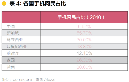 東南亞各國手機接入互聯(lián)網的比例新加坡最高;越南、馬來西亞、泰國次之;印度尼西亞和菲律賓大致相同,手機上網普及率相對較低。根據CNNIC數(shù)據,2010年底中國手機網民占比66.2%,高于相同時期任一東南亞國家,2011年底中國手機網民占比69.3%。