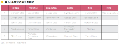 按照活躍用戶數(shù)進行排名如下表。Google、Yahoo、Facebook、Microsoft 在東南亞各國都排在前幾位,沒有較大差別。新加坡和印度尼西亞還有其他網站進入前五(新加坡:SPH Group、印度尼西亞:Wordpress),越南最大的互聯(lián)網公司是VNG Corporation。