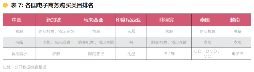 馬來西亞,印度尼西亞,菲律賓的消費者購買最多的是衣服,而新加坡和泰國消費者最熱衷的是購買機票和預定賓館。