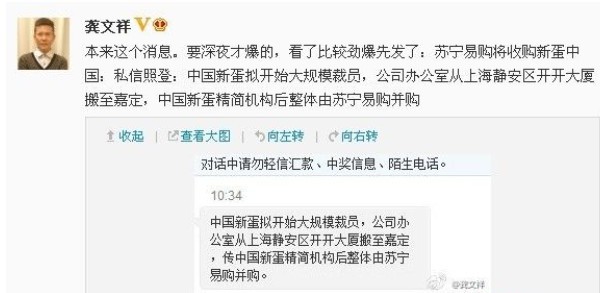 3月11日,中國資深電商人士龔文祥在微博中爆料,蘇寧易購將收購新蛋中國。龔文祥在微博中寫道:中國新蛋擬開始大規(guī)模裁員,公司辦公室從上海靜安區(qū)開開大廈搬至嘉定,中國新蛋精簡機(jī)構(gòu)后整體由蘇寧易購并購。