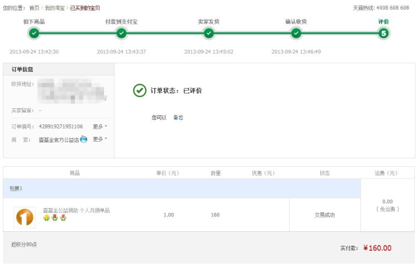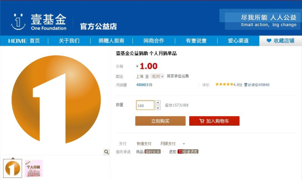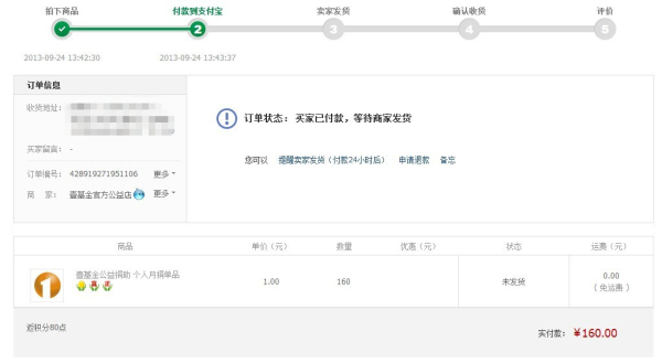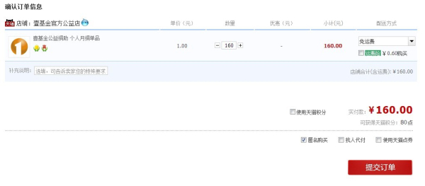 基于敬佩和尊重,本刊決定將捐款事宜進(jìn)行通告公示,歡迎各界人事監(jiān)督。家家福超市等網(wǎng)友所獲稿酬共160元,已通過(guò)支付寶壹基金官方公益店捐獻(xiàn)。