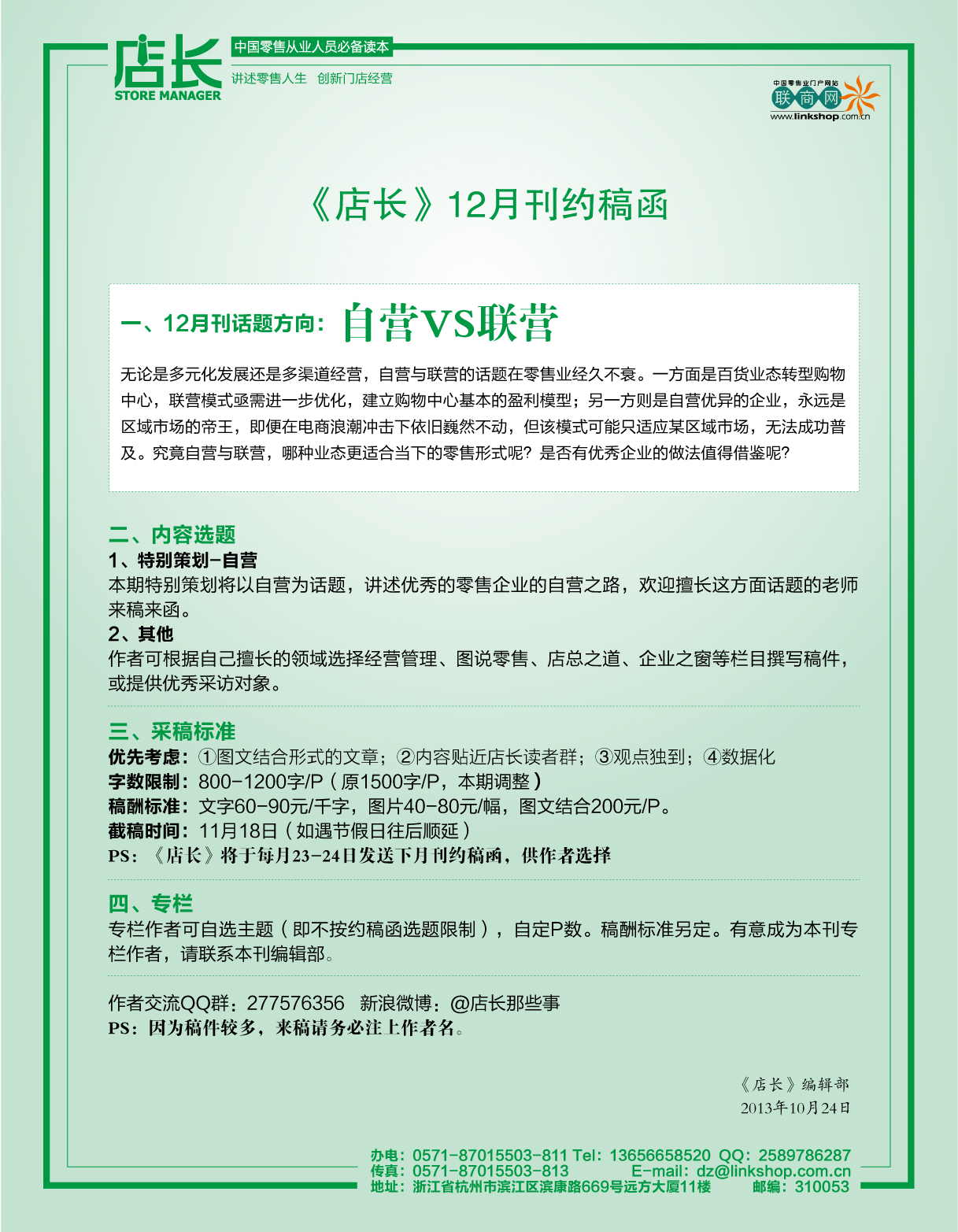 《店長(zhǎng)》12月刊 約稿函
