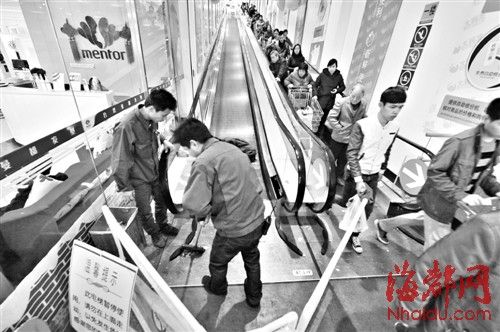 出事故的是超市1層與2層之間的一部手扶電梯。記者看到,這部電梯的入口已經(jīng)被圍了起來,超市方面也發(fā)出通告,提醒顧客該電梯已暫停使用。幾名維修工人正在緊急處理故障。