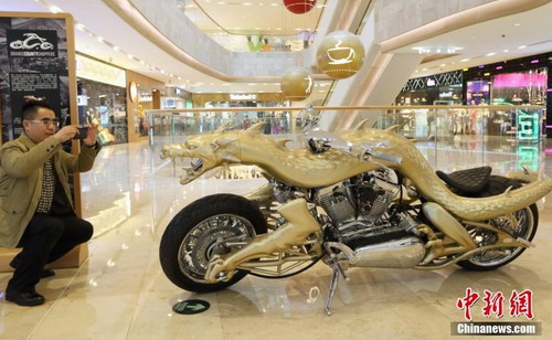 3月27日,市民被展出的“龍版”特別款OCC摩托車(chē)吸引。當(dāng)日,兩款來(lái)自美國(guó)的世界頂級(jí)手工定制摩托車(chē)亮相南京德基廣場(chǎng)。 。ㄖ行律 泱波 攝)