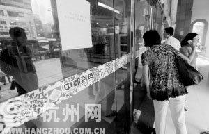 在繁華的慶春路上,不斷地有行人停下腳步,帶著或錯愕或麻木的神情,看向這家突然關(guān)門的百貨店。有的人和前面那位大姐一樣,走上臺階,到大門前,才發(fā)現(xiàn)店門已關(guān),嘗試著推門卻推不開,看到里面已經(jīng)掛上了一把鎖。
