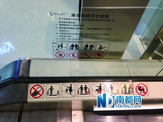 在海岸城,南都記者發(fā)現(xiàn)在每個扶梯邊商家都貼上了醒目的安全須知,既有文字版也有圖案版,例如商家會提示穿洞洞鞋的顧客要小心,避免被扶梯的邊緣卷入造成意外事件的發(fā)生;也會告知顧客如果有手推車或者嬰兒車的話最好使用升降機而不是扶梯……在上下扶梯的中間,為了防止好動的“熊孩子”進行攀爬,商業(yè)們已經(jīng)準(zhǔn)備好了既透明但又醒目的“禁止攀爬”標(biāo)牌來提醒家長們,減少意外的發(fā)生。