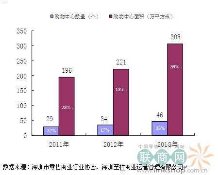 截至2013年末,深圳常住人口為1062萬,購物中心總的商業(yè)面積為308萬平方米。