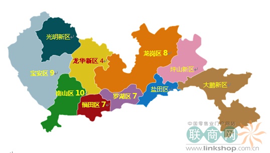 截至2013年底,深圳已開業(yè)運(yùn)營(yíng)的購物中心一共有46家,分別位于深圳十個(gè)行政區(qū)中的六個(gè)行政區(qū),其余四個(gè)行政區(qū)暫無開業(yè)的購物中心。