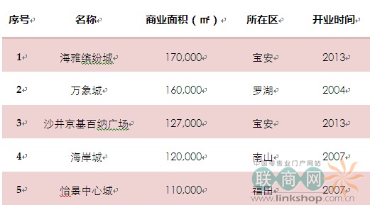 截至2013年底,深圳已開業(yè)面積最大的五個(gè)購物中心