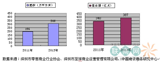 深圳購物中心2013年商業(yè)面積為308萬平方米,比2011年196萬平方米購物中心商業(yè)面積增加了112萬平方米,增幅達(dá)57%。然而2013年的營(yíng)業(yè)額僅比2011年的營(yíng)業(yè)額增加了47億元,增幅為13.8%,遠(yuǎn)低于同期社會(huì)消費(fèi)品零售總額25.9%的增幅。