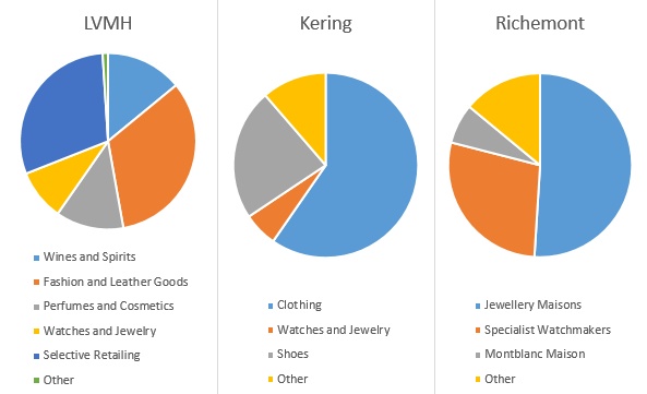 LVMH的主要業(yè)務(wù)是烈酒和時(shí)裝皮具類產(chǎn)品,Richemont 則側(cè)重珠寶和鐘表, Kering 的服裝類產(chǎn)品貢獻(xiàn)了最大份額的銷售額 – 值得注意的是,和前兩家專注于奢侈品行業(yè)不同,Kering 旗下三分之一的業(yè)務(wù)是以 Puma 為首的運(yùn)動(dòng)休閑類產(chǎn)品,奢侈品占三分之二。