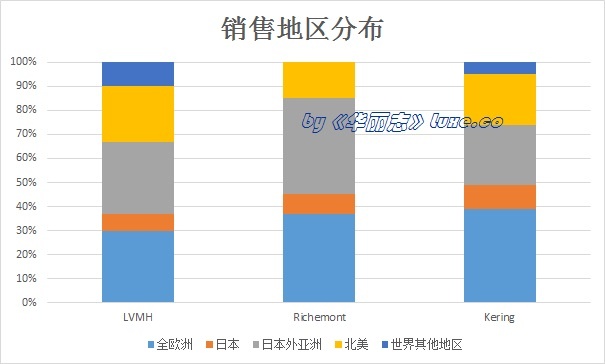 從銷售的地區(qū)分布看:三大集團(tuán)的銷售地區(qū)分布比較類似,其中 Richemont 來自日本外亞洲地區(qū)(包括大中華區(qū))的收入占比最高,另外兩家集團(tuán)更為分散。