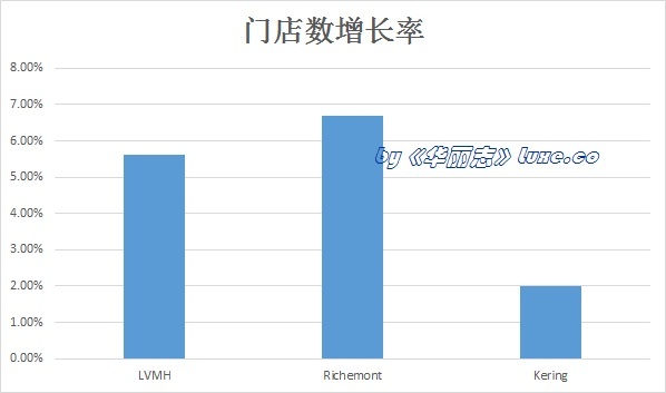 最后,三大集團(tuán)的門店數(shù)量變動(dòng)情況:增長率最高的是 Richemont,最低的是 Kering。