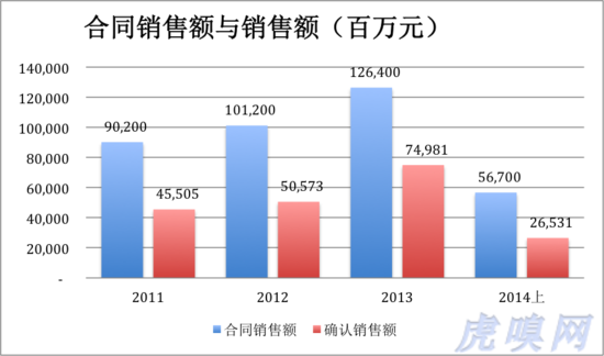 2011年、2012年,萬達(dá)商業(yè)地產(chǎn)將合同銷售額的一半確認(rèn)為營收。2013年,提高到59.3%,而今年上半年只將合同銷售額的28.7%確認(rèn)為營收。明白了這一節(jié),對2014年上半年?duì)I收同比下降27.2%就沒有必要大驚小怪了,萬達(dá)有可能是有意在財務(wù)上為上市后的增長“留出余地”,但另一方面也確實(shí)說明在物業(yè)銷售方面存在增長壓力。