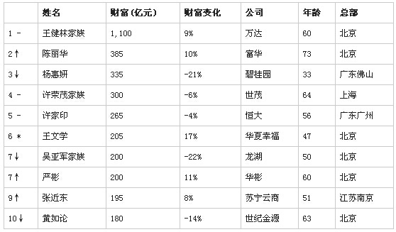 前十名房地產(chǎn)富豪平均財(cái)富336.5億元,和去年前十名的平均財(cái)富差不多。前十名中連續(xù)兩年只有1位新人,今年是47歲華夏幸福的王文學(xué)新進(jìn)入前十。前十名中,有3位持有物業(yè)量較大,分別是王健林、陳麗華和黃如論。前十名中有一半企業(yè)的房地產(chǎn)部分未上市,上市的一半中有4家是在香港上市的。前十名中總部在北京的有6家,其次是廣東,有2家。前三名中2位女富豪。