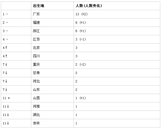 從企業(yè)家出生地來看,粵商仍然最多,有13位,比去年增加2位;其次是閩商和浙商,分別有8位和6位。