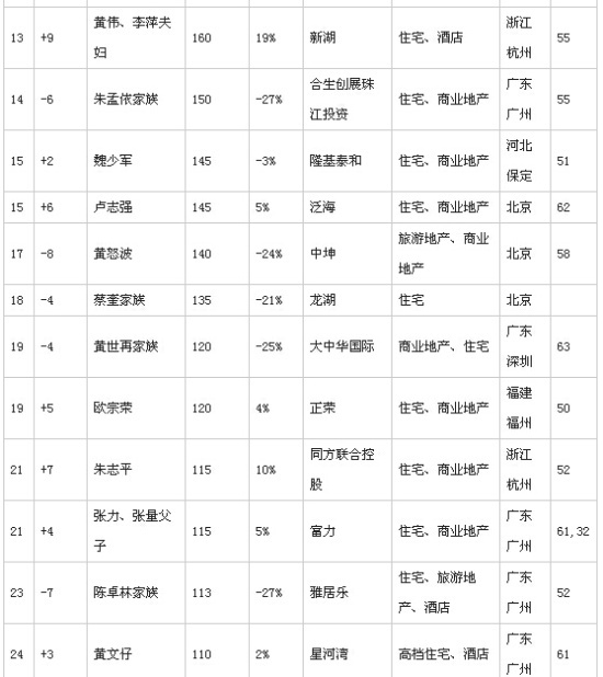 去年上榜今年沒上榜的房地產(chǎn)富豪 有8位,因?yàn)闆]有夠上65億元的上榜門檻而沒有上榜,他們是:廣匯集團(tuán)的孫廣信、億達(dá)集團(tuán)的孫蔭環(huán)、協(xié)信控股的吳旭、明發(fā)集團(tuán)的黃煥明、蘇寧環(huán)球的張桂平、張康黎父子、金科地產(chǎn)的黃紅云、仲盛的葉立培和創(chuàng)鴻集團(tuán)的黃鴻明。
