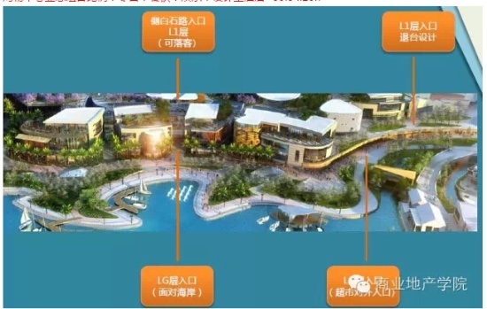 1)主入口:多入口,多首層,退臺(tái)設(shè)計(jì);另外,在項(xiàng)目東側(cè)還有退臺(tái)式設(shè)計(jì),可直達(dá)L2層麥魯小鎮(zhèn)以及屋頂花園,但是退臺(tái)處于關(guān)閉狀態(tài)。
