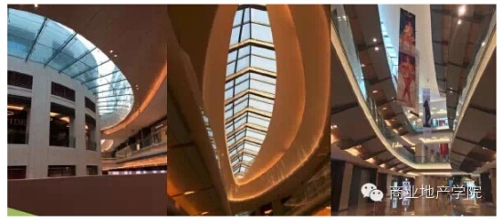 雖然頂部有很多的采光玻璃,但是可能由于整體結(jié)構(gòu)原因,采光率很低。例如左側(cè)圖片,采光玻璃兩側(cè)均有更高的建筑,遮擋了陽光,所以商場內(nèi)部光線很暗,給人以壓抑的感覺。