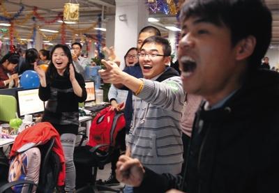 11月11日凌晨0點(diǎn)01分,“雙十一”促銷剛開始一分鐘,位于通州的某服裝公司總部?jī)?nèi),部分員工看著不斷攀升的銷售額,發(fā)出歡呼。新京報(bào)記者 李冬 攝