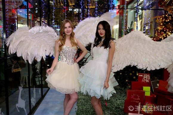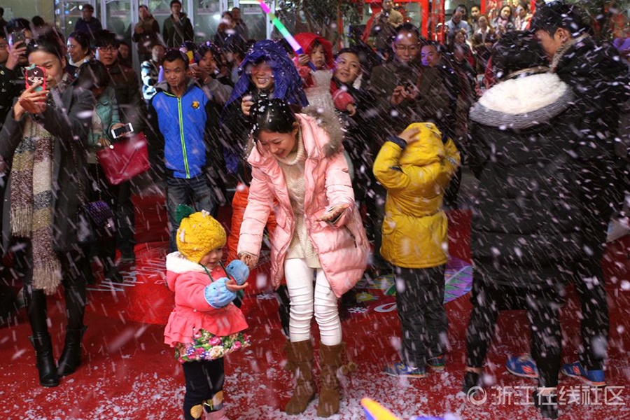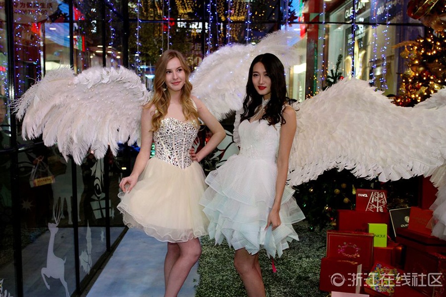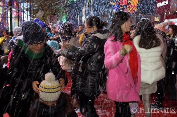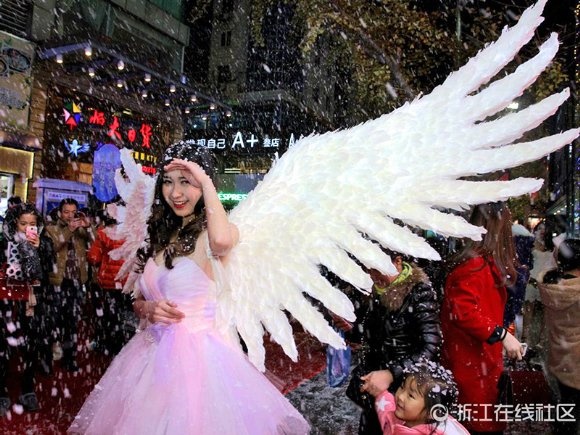 12月12日晚上,浙江省金華市區(qū)西市街上,一群身戴潔白翅膀的“天使”,伴隨著漫天“飛雪”降臨街頭,讓逛街的市民大飽眼福。這是當(dāng)天晚上,市區(qū)一家百貨商場(chǎng)為周年店慶策劃的一場(chǎng)視覺(jué)盛宴,圍觀市民在盡情地嬉“雪”狂歡的同時(shí),紛紛拿相機(jī)或手機(jī)拍照留影,把整條步行街?jǐn)D得水泄不通。