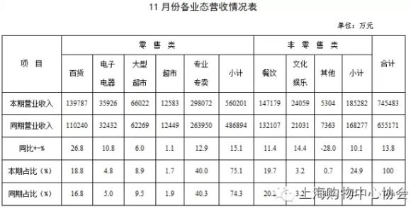 本月在電商“雙十一”沖擊下,營收規(guī)模環(huán)比略有下降,同比依然保持增長態(tài)勢,經(jīng)我會(huì)和市商業(yè)信息中心對96家企業(yè)的《購物中心企業(yè)經(jīng)營情況》報(bào)表匯總(有部分企業(yè)因商場調(diào)整沒有數(shù)據(jù)上報(bào)),11月份營業(yè)總規(guī)模為74.55億元,按去年同期同口徑65.52億元,同比增長13.8%;剔除新增6家企業(yè)因素,同比增長6.5%,按上期同口徑79.91億元,環(huán)比減少6.7%。