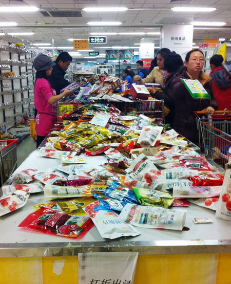 12月27日,當日促銷的商品多為餅干、話梅類的零食,不少市民的推車里裝滿了搶購的商品。