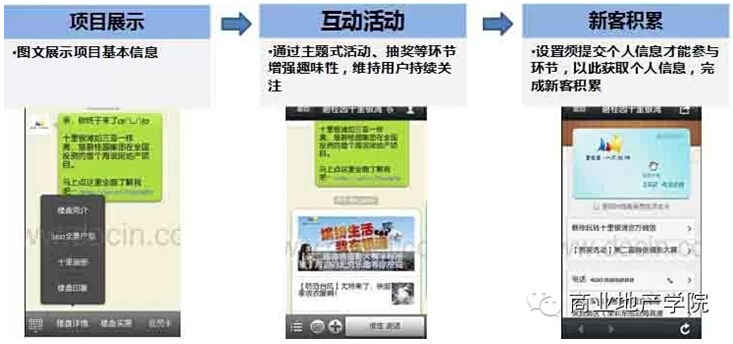 以項目為單位的微信平臺是目前地產(chǎn)微信平臺運用最廣泛的方式,主要包含項目展示、互動活動及會員中心3大功能。