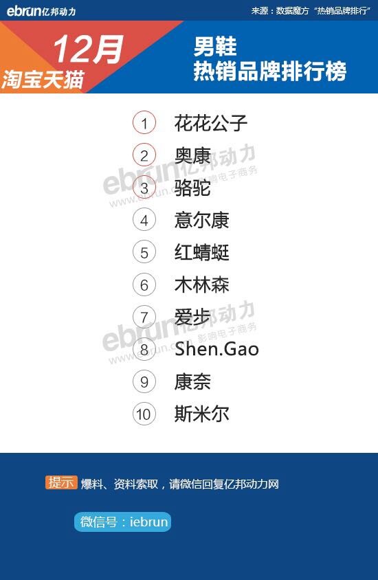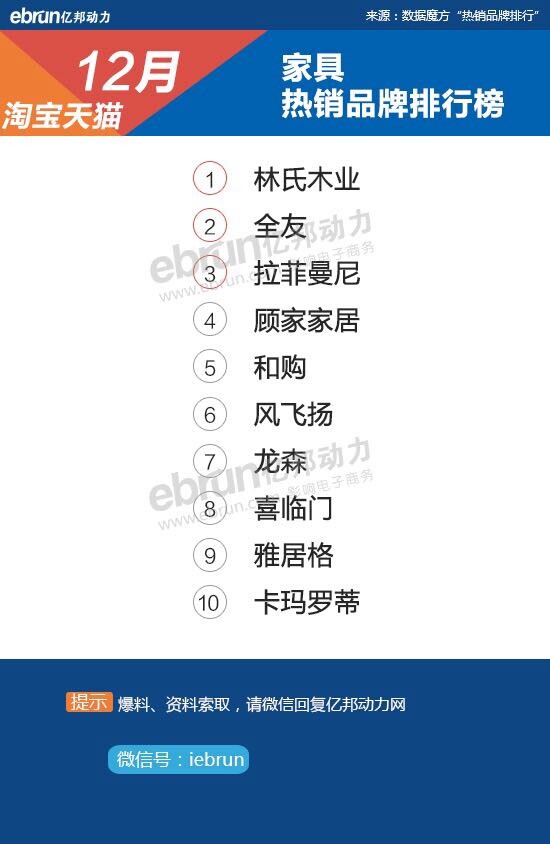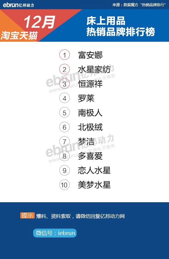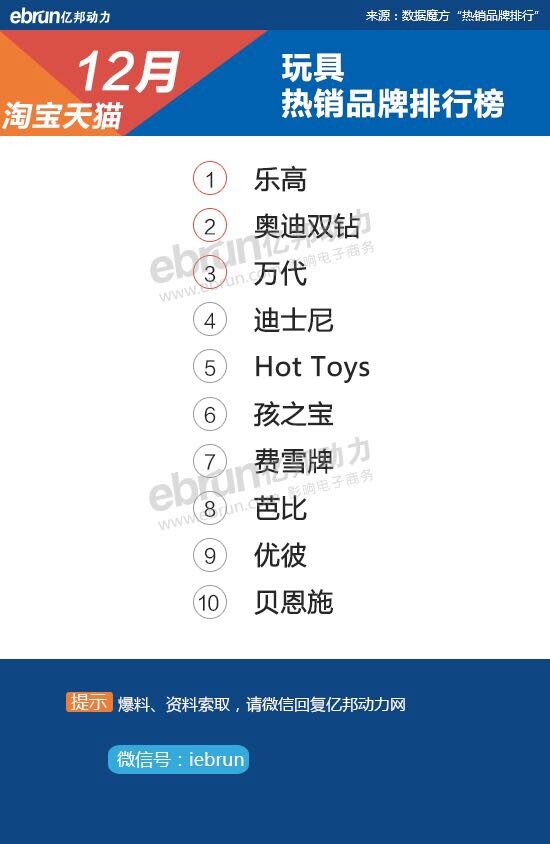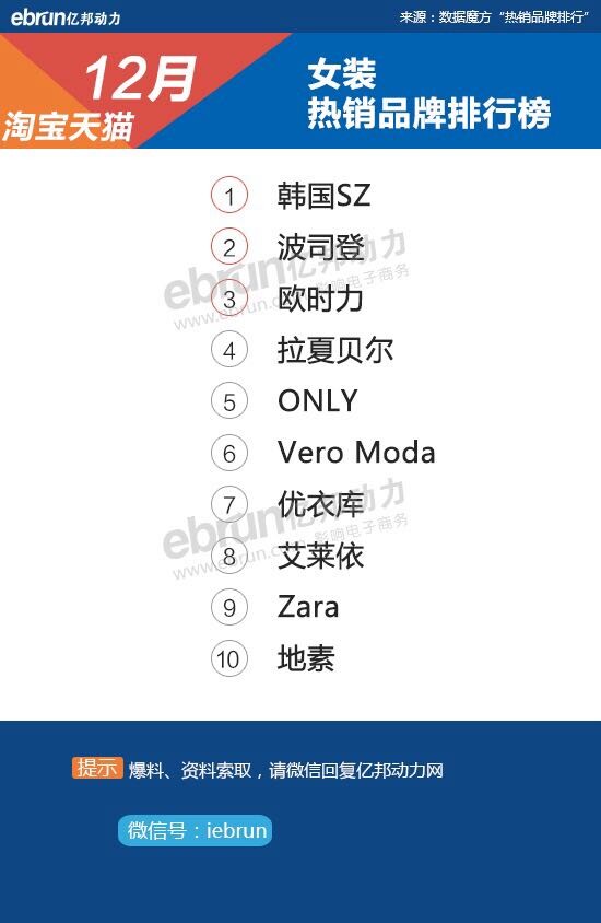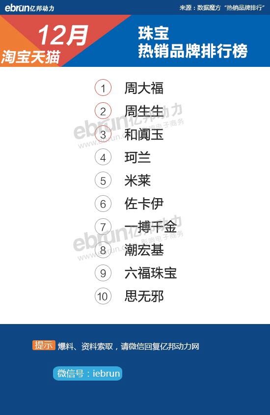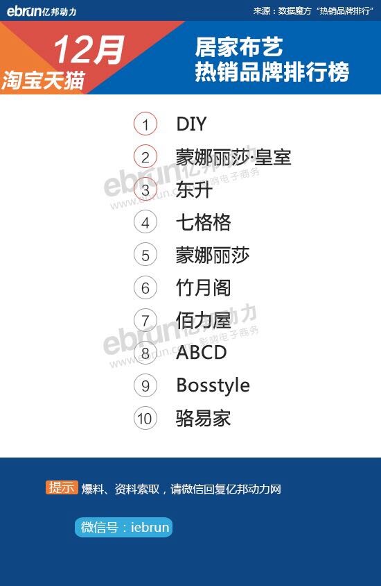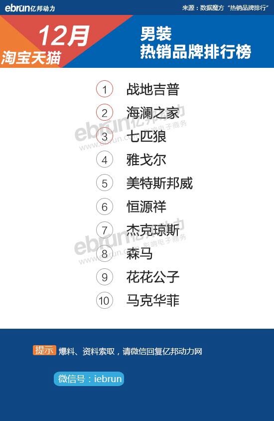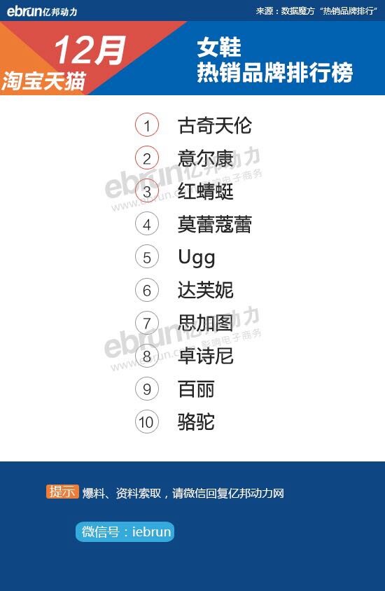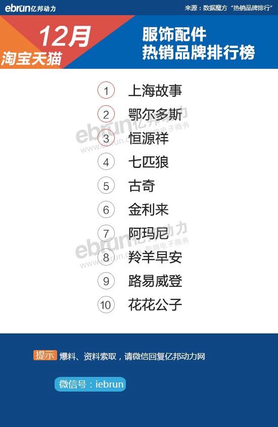 根據(jù)數(shù)據(jù)魔方的相關(guān)資料,億邦動力網(wǎng)對淘寶(含天貓)2014年12月份銷售排名前十的品牌進(jìn)行了匯總,共28個類目,僅供參考。