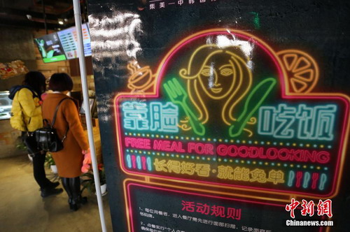 近日,鄭州市一家餐廳推出“靠臉吃飯”主題活動,食客可通過掃描容貌,專家根據食客面容對比“專業(yè)評分標準”進行打分,每半個小時進入餐廳的所有食客為一組,容貌得分最高的前五位可享受免單特權,一天最多可免50人。 (中國新聞網)