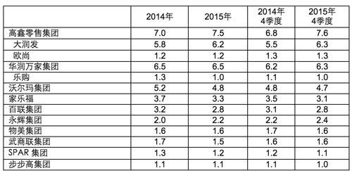 隨著競爭的加劇和整體市場增長放緩,零售商必須擴(kuò)大規(guī)模以優(yōu)化成本結(jié)構(gòu),提升他們在和供應(yīng)商談判中的優(yōu)勢。永輝在2015年通過對于聯(lián)華部分股份的收購,瞄準(zhǔn)了聯(lián)華仍居強(qiáng)勢地位而人均消費(fèi)力較強(qiáng)的華東市場。紅旗通過兼并互惠超市,使其在中國西部市場的份額也迅速擴(kuò)大到1.5%。盡管經(jīng)歷了過去數(shù)年的合并收購,中國零售市場相對發(fā)達(dá)國家碎片化的格局并未得到根據(jù)改變,前十大零售集團(tuán)在現(xiàn)代通路銷售額中僅占不到三分之一,因此區(qū)域零售企業(yè)之間的合作并購大戲在2016年仍將延續(xù)。