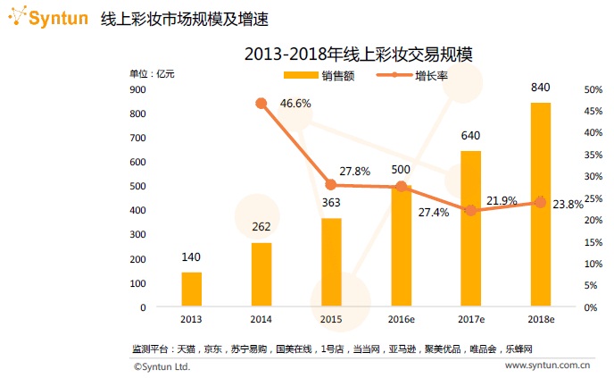 據(jù)谷熠介紹,2013年線上彩妝交易總額為140億元,而在2014年,這一數(shù)據(jù)猛增近2倍,達(dá)到262億元。2015年開始,線上彩妝交易增長趨于平穩(wěn),維持在25%左右。谷熠認(rèn)為,通過數(shù)據(jù)分析,未來三年交易額仍將保持持續(xù)增長,“這說明市場(chǎng)體量同樣呈現(xiàn)持續(xù)增長趨勢(shì)!