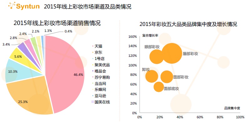 對(duì)于彩妝五大品類,2015年線上唇部彩妝與眼部彩妝增長均超過100%。相比較而言,卸妝類產(chǎn)品雖然增長率只有80%,品牌集中度卻不到17%,這說明卸妝類還有很大空間。谷熠建議,大家可以集中關(guān)注眼部彩妝與卸妝兩類。
