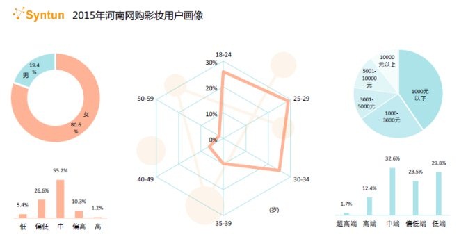 河南地區(qū)網(wǎng)購彩妝消費(fèi)者為例,相較全國整體而言,河南彩妝消費(fèi)群體年齡整體偏大,消費(fèi)水平同樣多處于中低水平,就產(chǎn)品來說更加偏愛氣墊BB與唇膏唇釉。