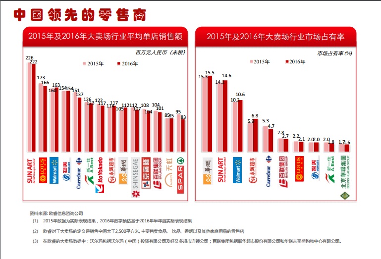 截至2017年6月30日,高鑫零售在全國共有446家綜合性大賣場,總建筑面積約為1210.5萬平方米,其中約69%為租賃門店,30.8%為自有物業(yè)門店及0.2%為承包店鋪。