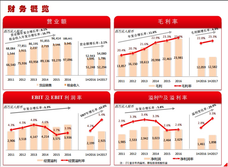 1、營業(yè)額:上半年實現(xiàn)總營業(yè)額540.8億元,同比增長2.1%,其中銷售貨品所得營業(yè)額522.94億元,同比增長2.0%;租金收入所得營業(yè)額17.86億元,同比增長5.4%。