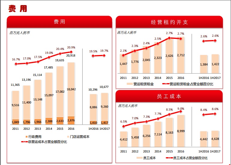2、同店銷售:上半年同店銷售增長為-0.90%,去年同期為-0.3%。