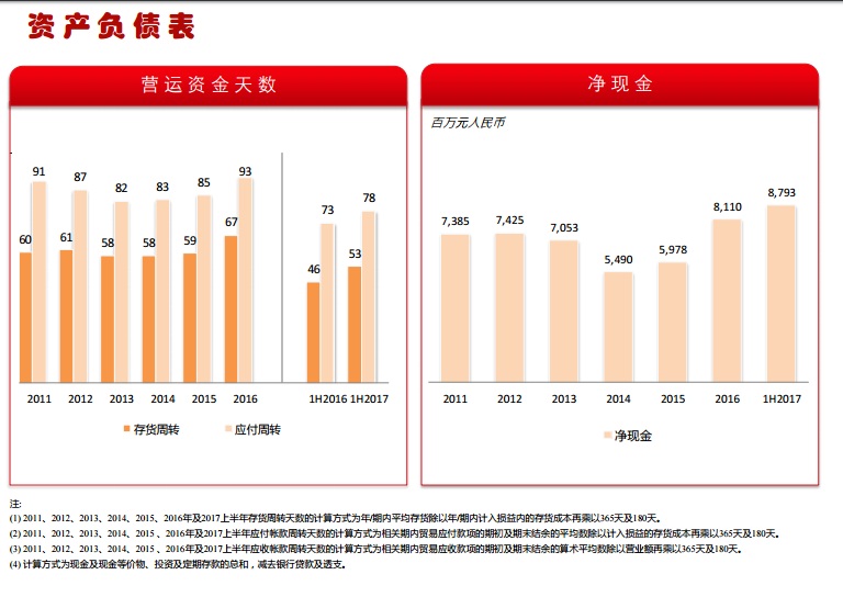10、存貨及應付款的周轉天數(shù):上半年存貨及應付款的周轉天數(shù)分別為53天及78天,去年同期分別為46天及73天。