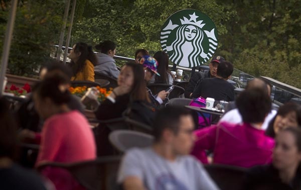 (上海人民廣場,顧客們在星巴克內(nèi)喝咖啡。)