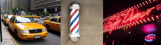 而“行業(yè)”也有職業(yè)形象,也就是“行業(yè)特征”。許多行業(yè)都有特定的視覺表達(dá):代表出租車的“特別配色”,代表發(fā)廊的“轉(zhuǎn)燈”,代表娛樂場所的“霓虹燈”。