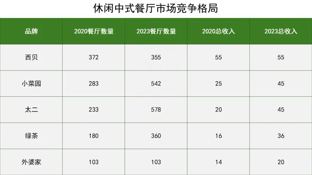 根據(jù)灼識咨詢的報告,2023年,綠茶和外婆家分別位列五大休閑中式餐廳的第四名和第五名,品牌收入分別為36億元和20億元,實(shí)力依然不容小覷。