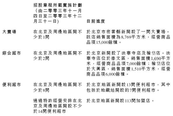 本集團(tuán)于二零零三年十二月自行開(kāi)設(shè)了旗下第一間大賣(mài)場(chǎng)— 密云鼓樓店。此店位于北京密云縣鼓樓大街,銷售面積8,769平方米,經(jīng)營(yíng)約15,000種商品。開(kāi)業(yè)當(dāng)日,該大賣(mài)場(chǎng)銷售額約為人民幣150萬(wàn)元。密云鼓樓店地處密云縣最佳商業(yè)區(qū),商圈潛質(zhì)優(yōu)厚。密云鼓樓店的開(kāi)業(yè)將為本集團(tuán)營(yíng)業(yè)額的提升及擴(kuò)大本集團(tuán)于北京零售市場(chǎng)的所占份額做出貢獻(xiàn)。
