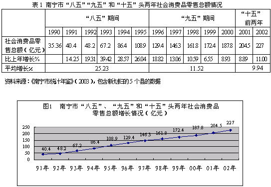資料來源:《南寧市統(tǒng)計(jì)年鑒》(2003)和南寧市商業(yè)貿(mào)易局有關(guān)資料,包含新劃歸的5個(gè)縣數(shù)據(jù)